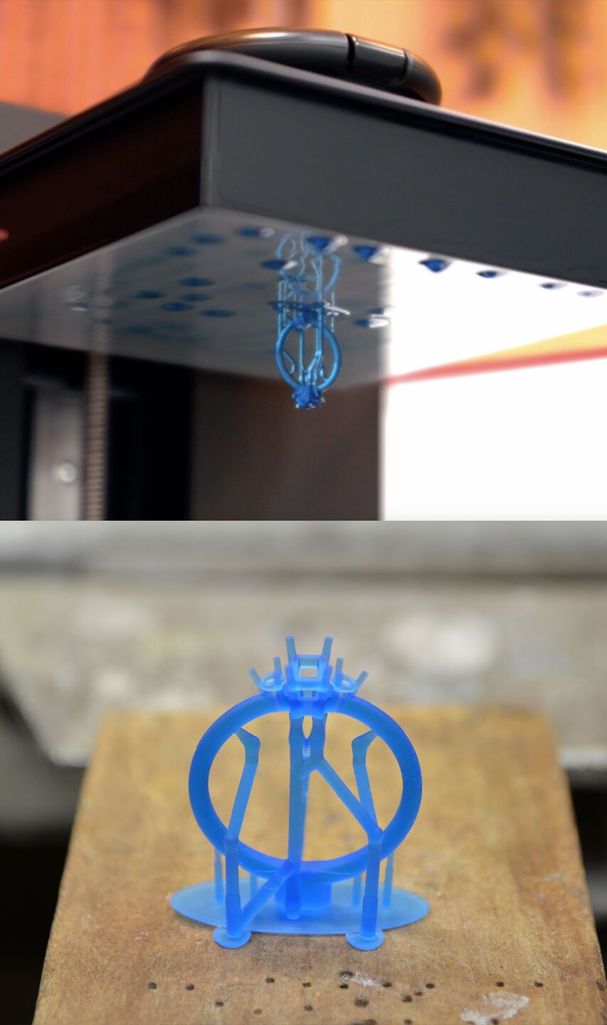 Das SLA Verfahren eignet sich besonders gut für die Herstellung von filigranen Strukturen, glatten und präzisen Oberflächen. Ein Laser, der über bewegliche Spiegel gesteuert wird, fährt über das Ausgangsmaterial um die gewünschte Form auszuhärten.